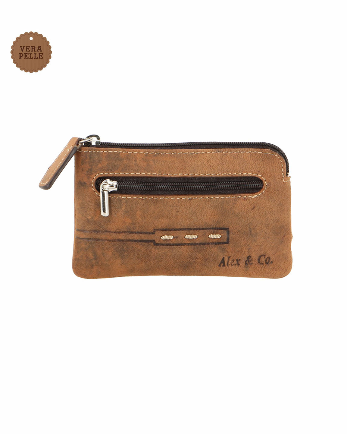 ALEX & CO - Borsellino portaspicci marrone in VERA PELLE con doppio anello portachiavi e taschino frontale