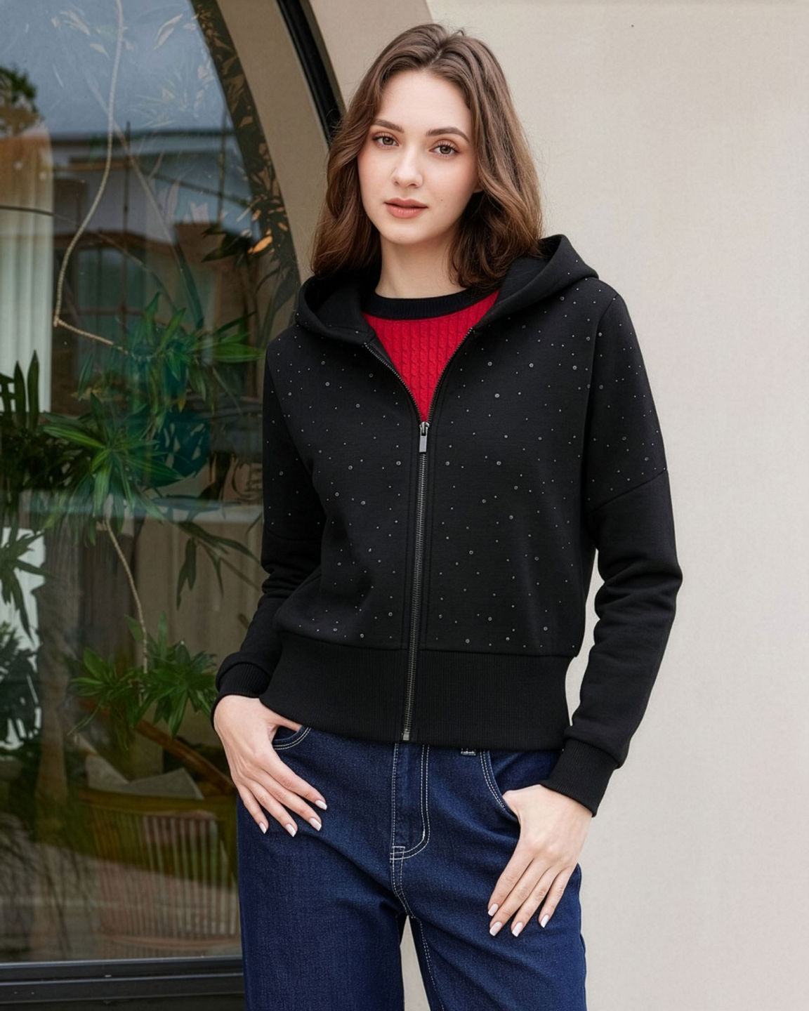 BACHATA - Felpa corta con cappuccio e maniche a pipistrello da donna zip intera ner