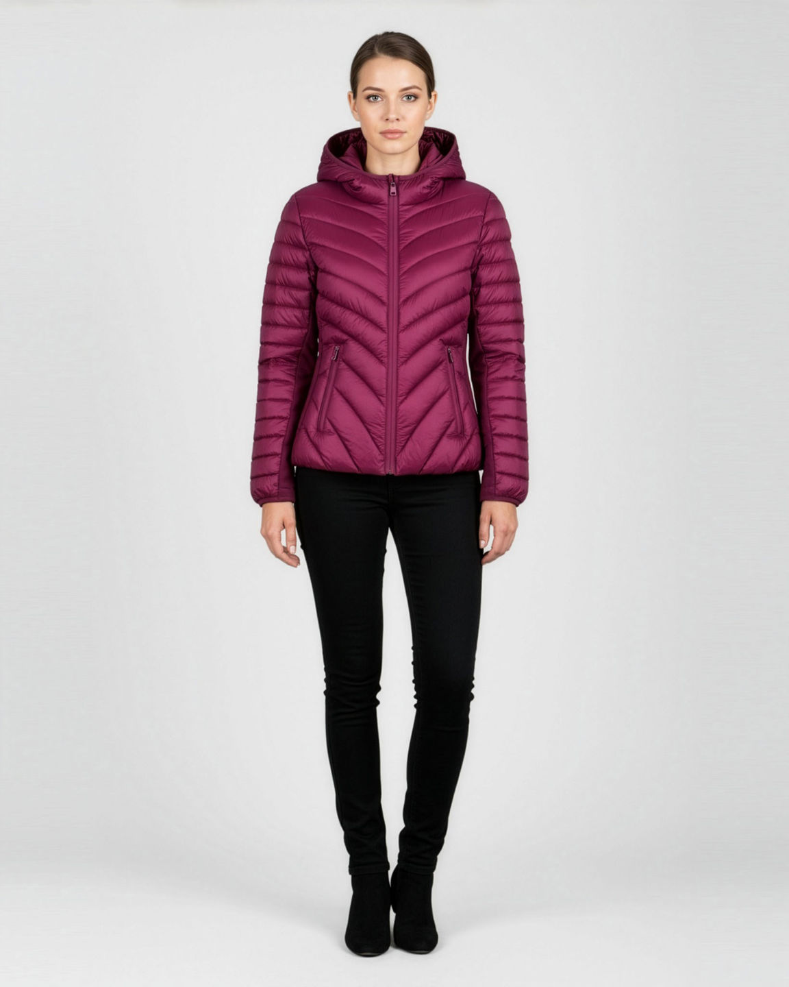 Piumino leggero 100 grammi dal design moderno e femminile, ideale per la mezza stagione. Realizzato in tessuto tecnico trapuntato con imbottitura leggera, assicura calore senza appesantire la silhouette.