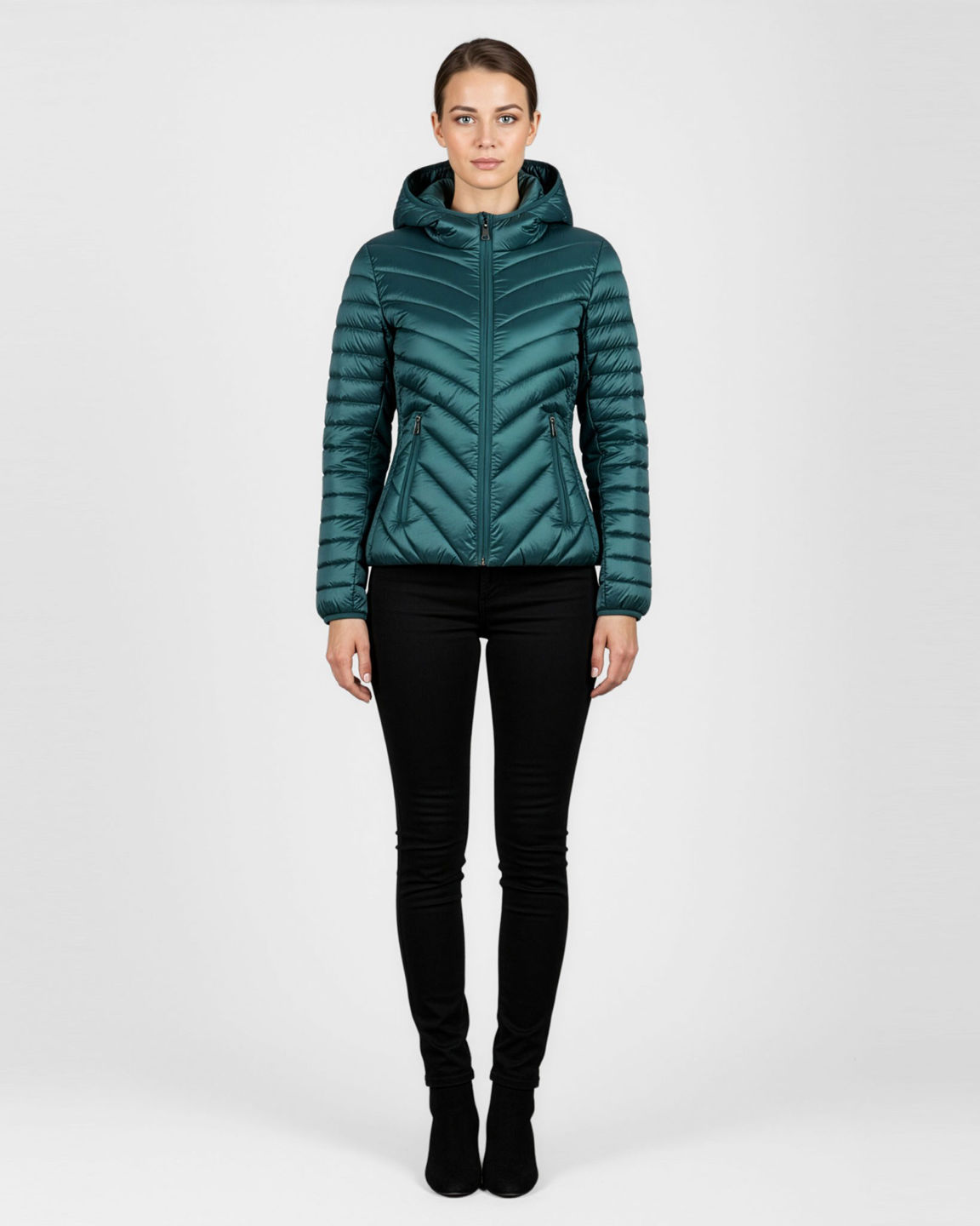 Piumino leggero 100 grammi dal design moderno e femminile, ideale per la mezza stagione. Realizzato in tessuto tecnico trapuntato con imbottitura leggera, assicura calore senza appesantire la silhouette.