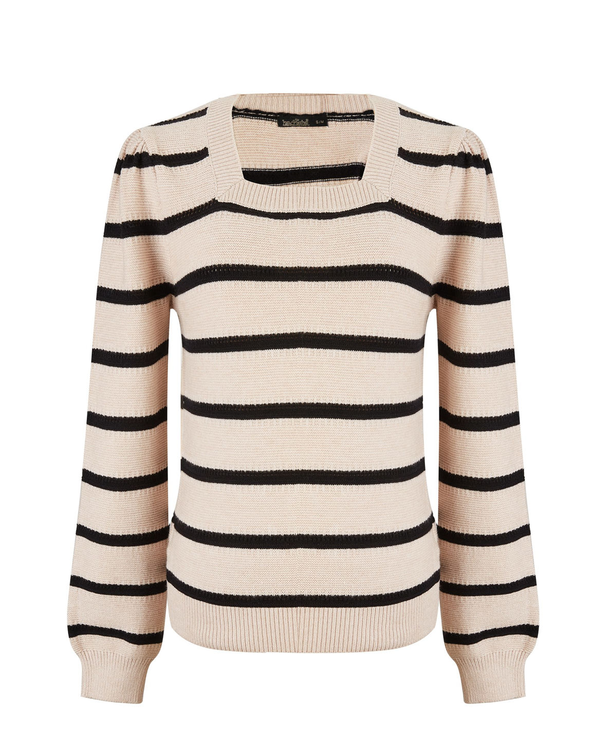 BACHATA - Maglia manica lunga beige a righe nere con scollo quadrato