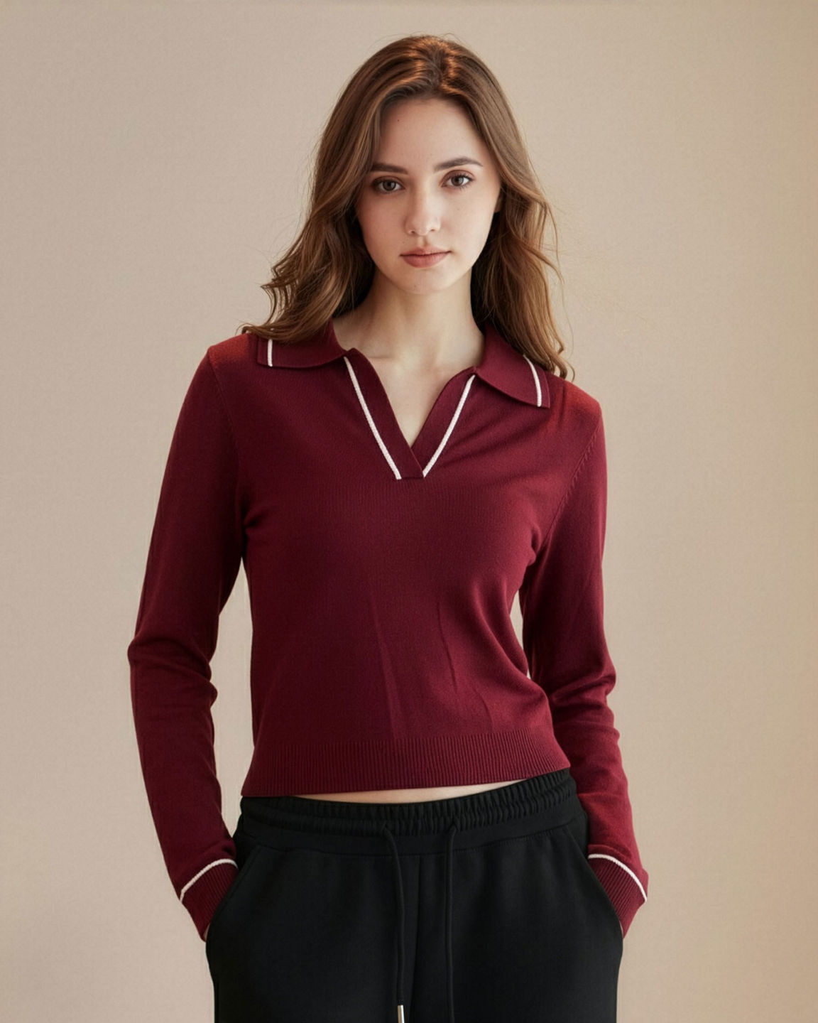 BACHATA - Maglia manica lunga bordeaux con scollo a V e colletto da donna