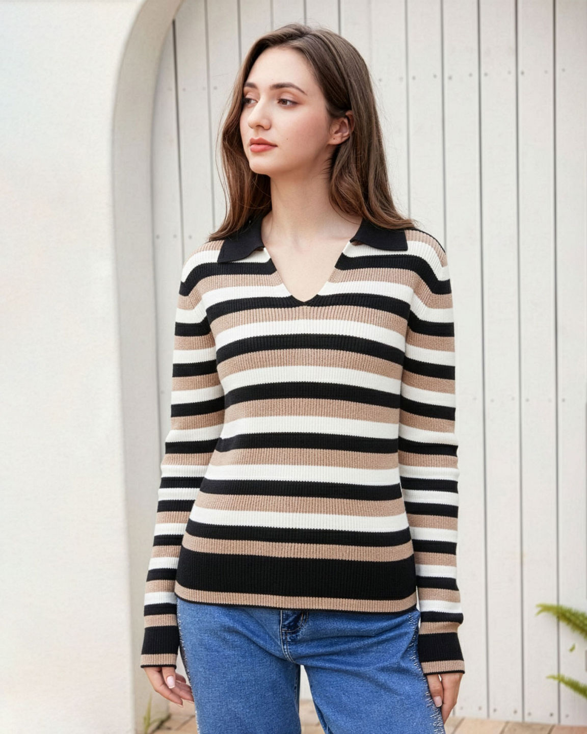 BACHATA - Maglia manica lunga con scollo a V tessuto a costina nera/bianca/camel
