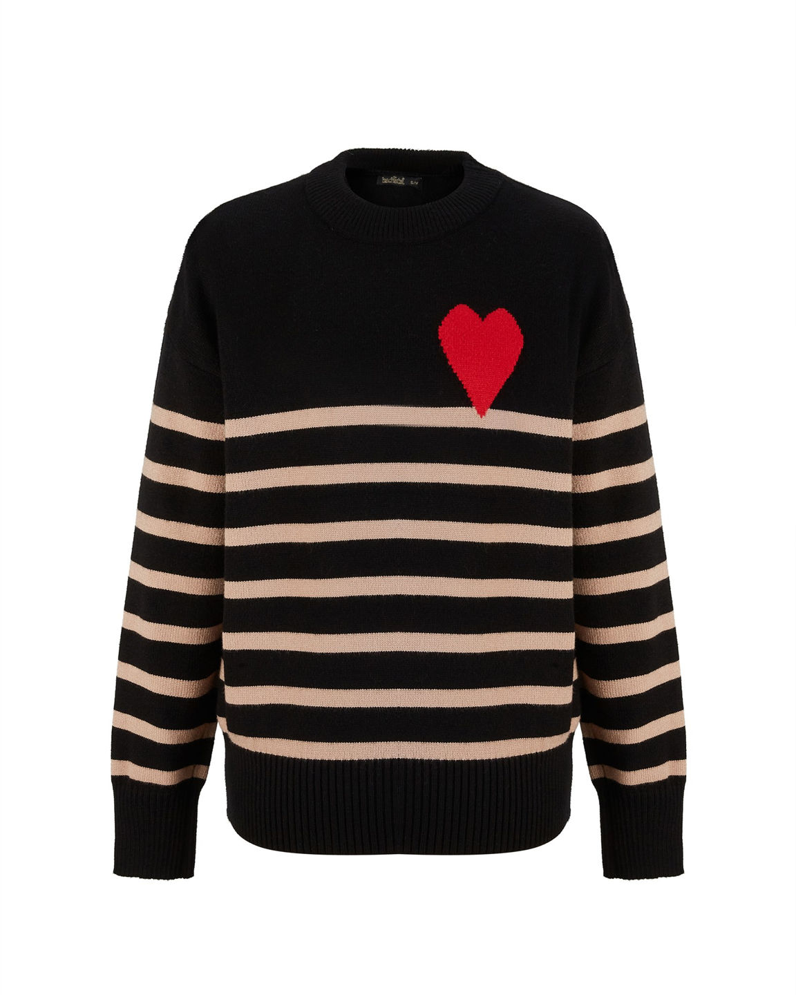 BACHATA - Maglia manica lunga nera a righe beige e cuore