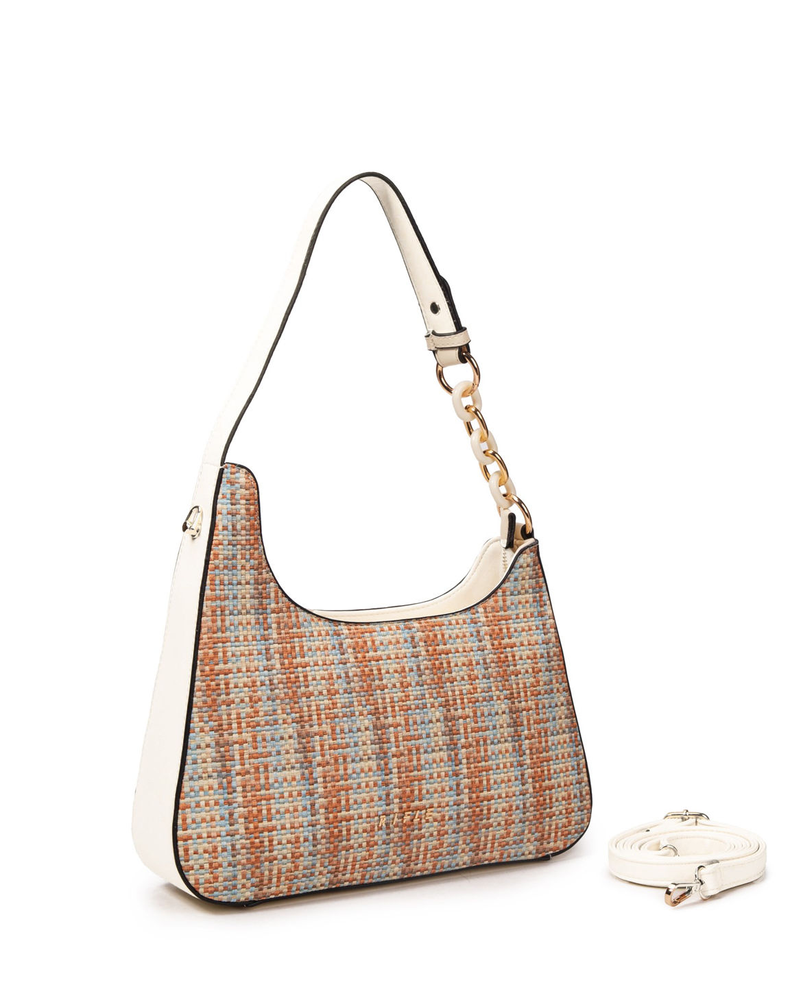 RIFLE - Borsa a spalla bianca e nera effetto intreccio con tasca posteriore e catena sul manico, tracolla removibile