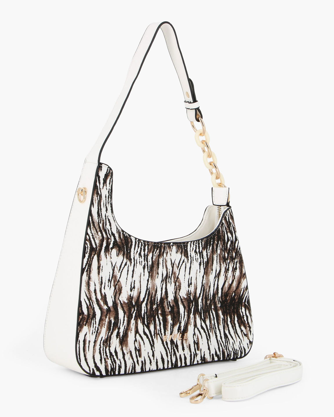 RIFLE - Borsa a spalla maculata con tasca posteriore e catena sul manico, tracolla removibile