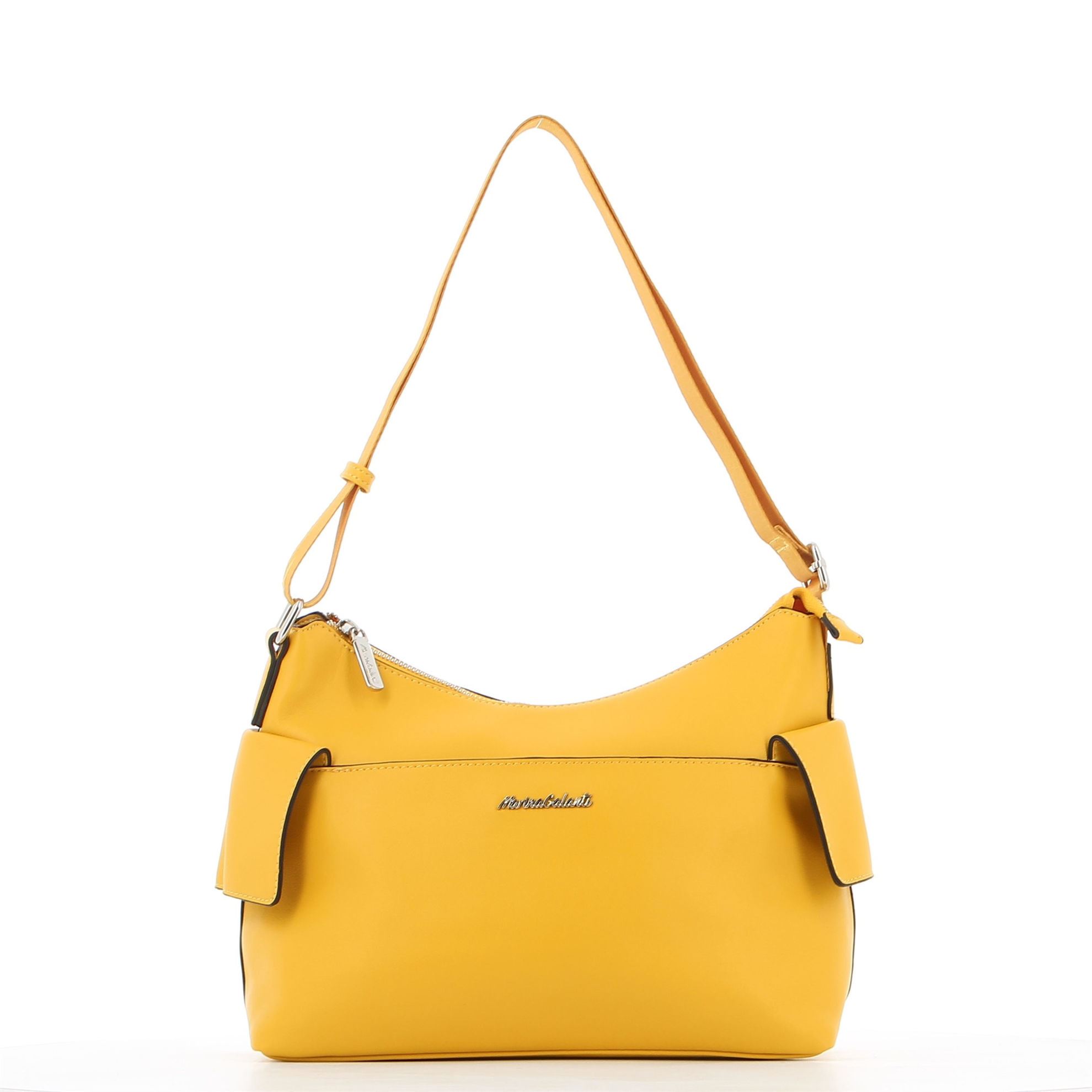 Borsa gialla con manico regolabile e tasche laterali con patta