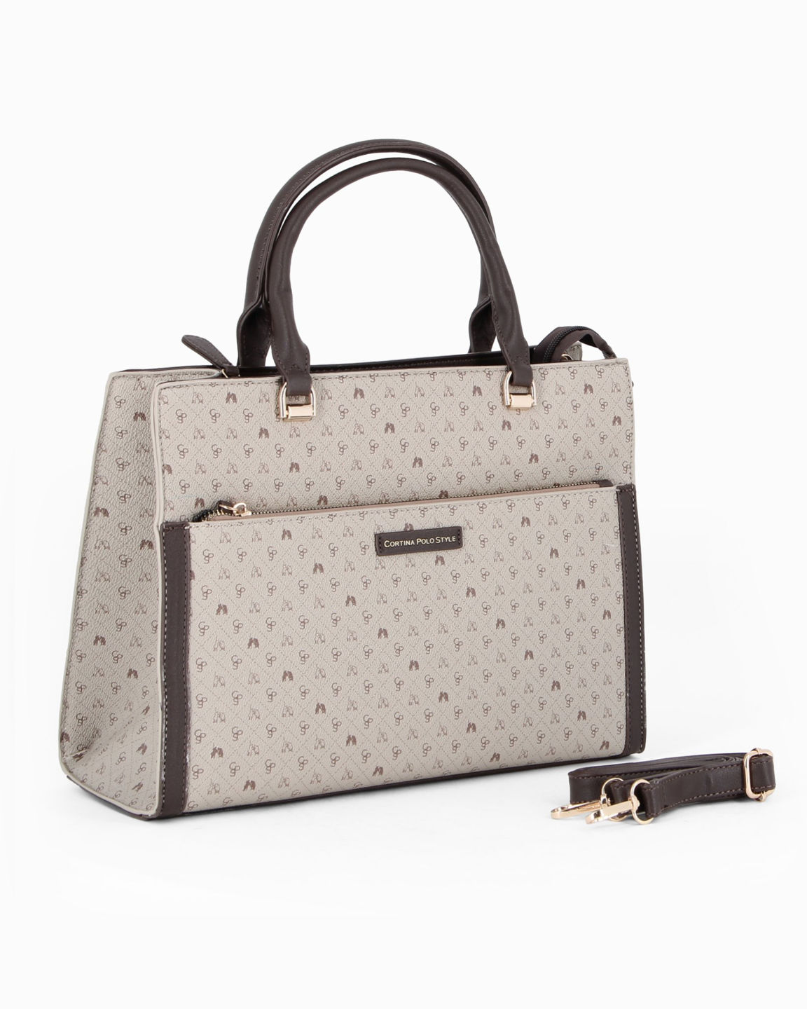 CORTINA POLO STYLE - Borsa due manici taupe loggata con tasca frontale, tracolla removibile