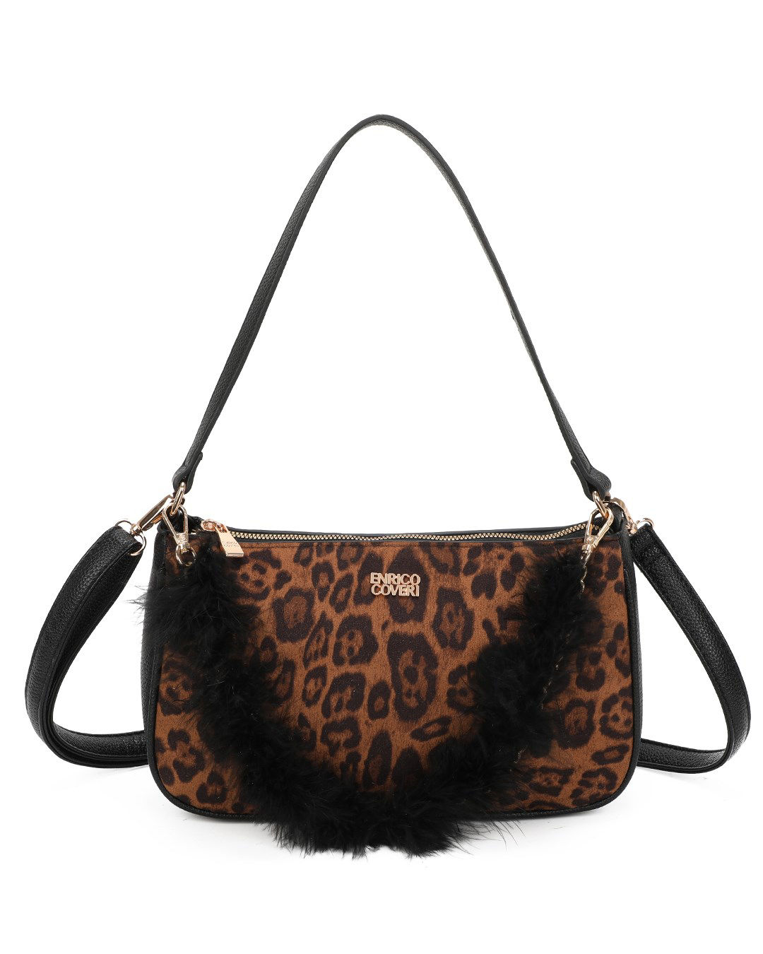 ENRICO COVERI - Borsa a spalla leopardata con dettaglio catenina con piume, tracolla removibile