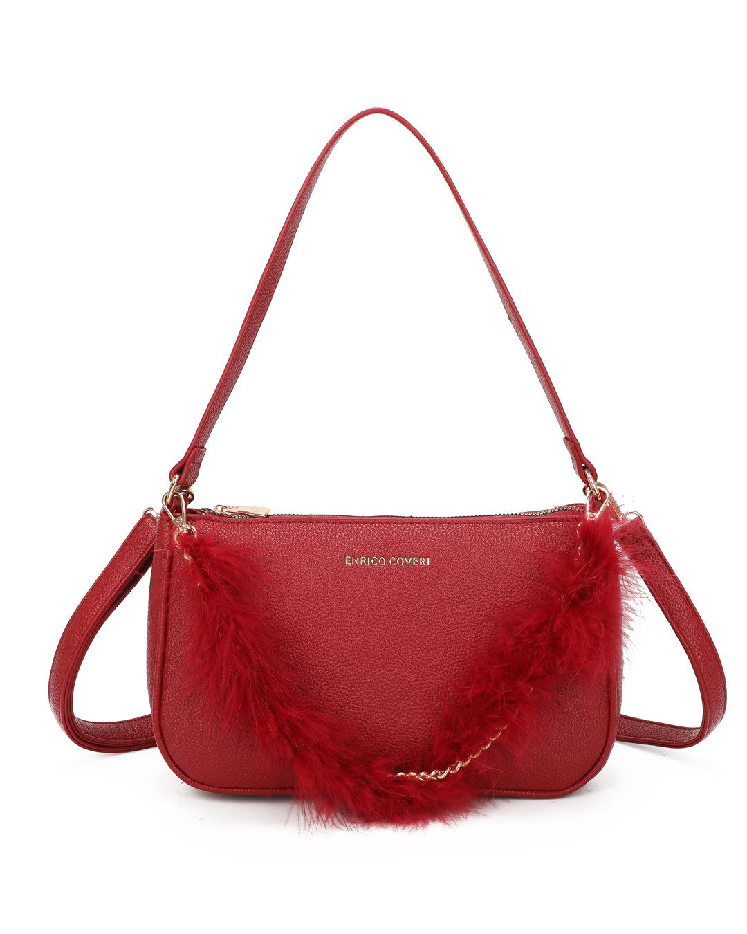 ENRICO COVERI - Borsa a spalla rossa con dettaglio catenina con piume, tracolla removibile