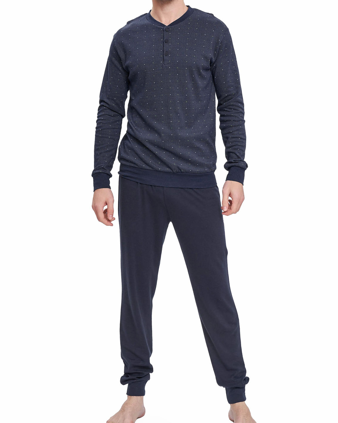 Pigiama in cotone con maglia serafino manica lunga a fantasia con polsini più pantalone lungo tinta unita con polsini