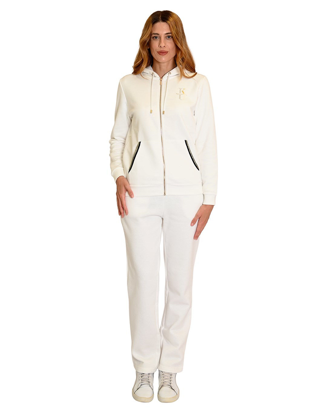Il completo si presenta in un bianco ottico luminoso, impreziosito da lussuosi dettagli metallici in oro, come la zip frontale e i finalini dei cordini.br>