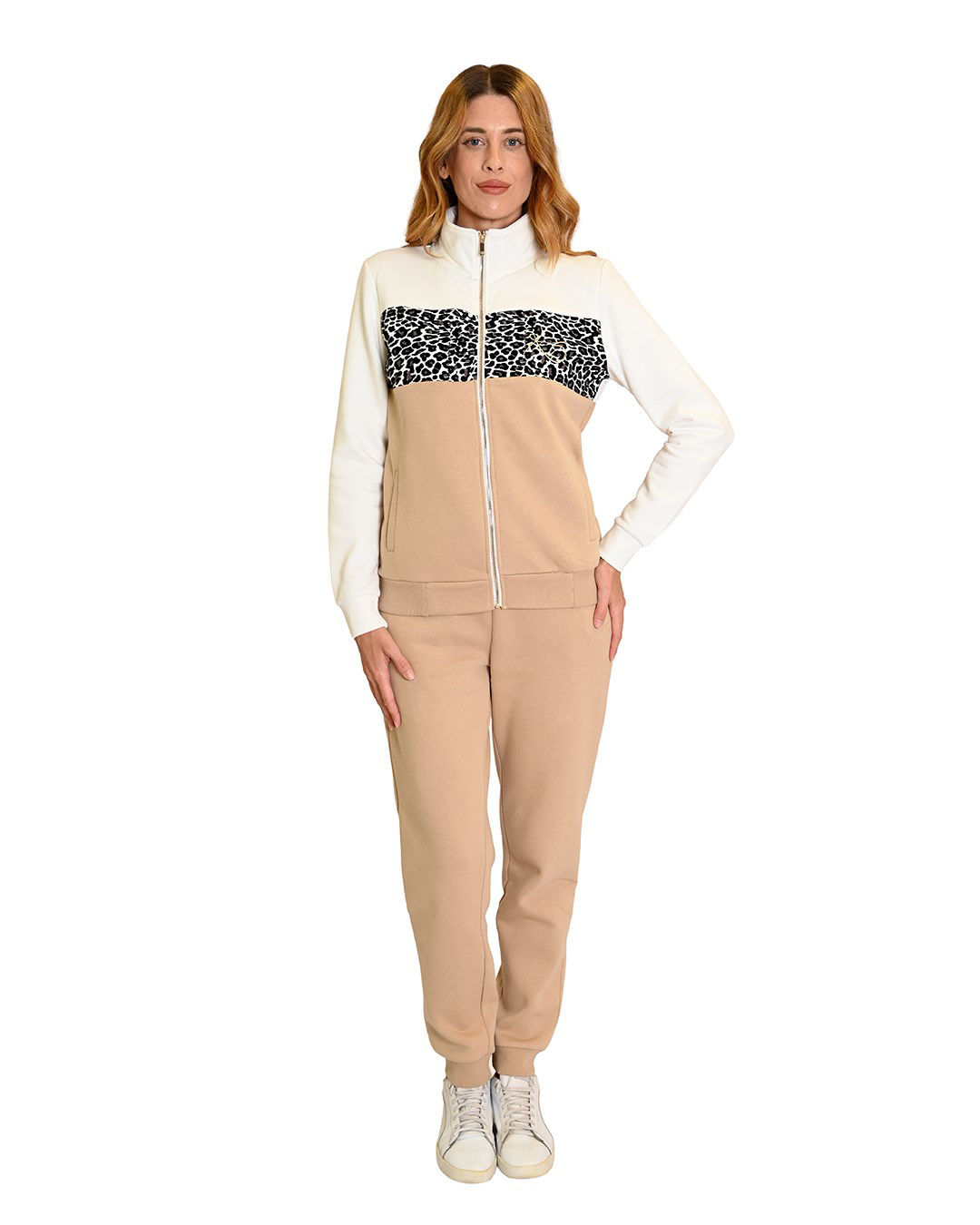 Caratterizzata da un collo alto protettivo e una chiusura a zip integrale. La parte superiore bianca si unisce alla base color cammello tramite un’accattivante fascia con stampa animalier (leopardata) in bianco e nero, che dona carattere all'intero outfit.