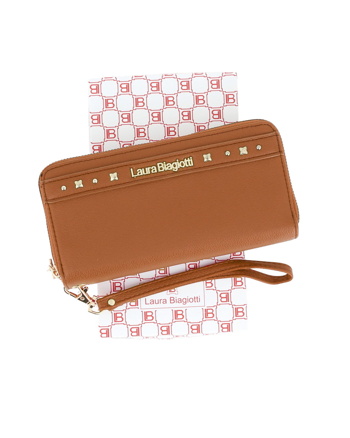 LAURA BIAGIOTTI - Portafoglio cognac da donna con doppia cerniera e polsiera removibile, dettaglio borchie