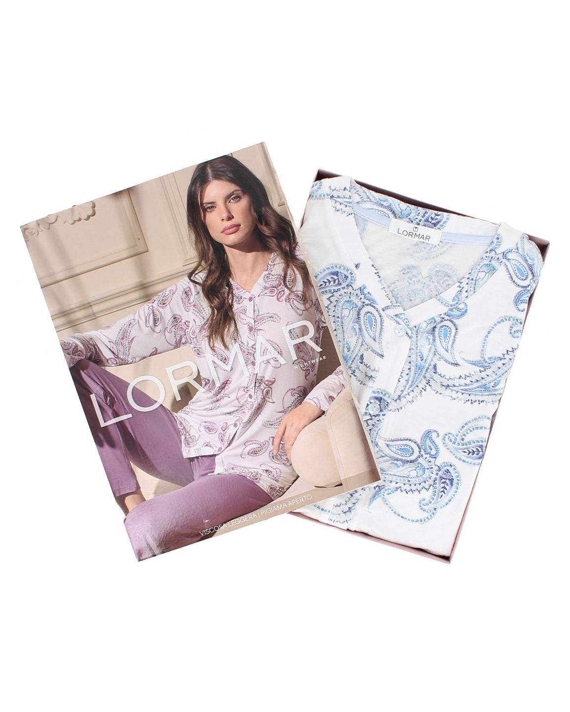 I Pigiami Aperti Lormar richiamano il fascino intramontabile dello stile classico. Con giacca abbottonata e pantalone coordinato, regalano un look elegante e sofisticato anche nei momenti di relax. Realizzato in viscosa leggera elasticizzata è caratterizzata da una stampa cachemire, ideali per chi desidera un’eleganza senza tempo.