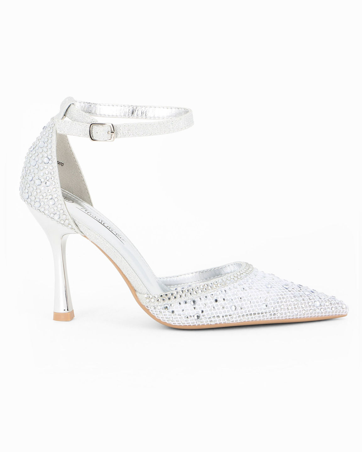 MISS GLOBO - Décolleté argento traforata con strass e cinturino alla caviglia, tacco 9CM