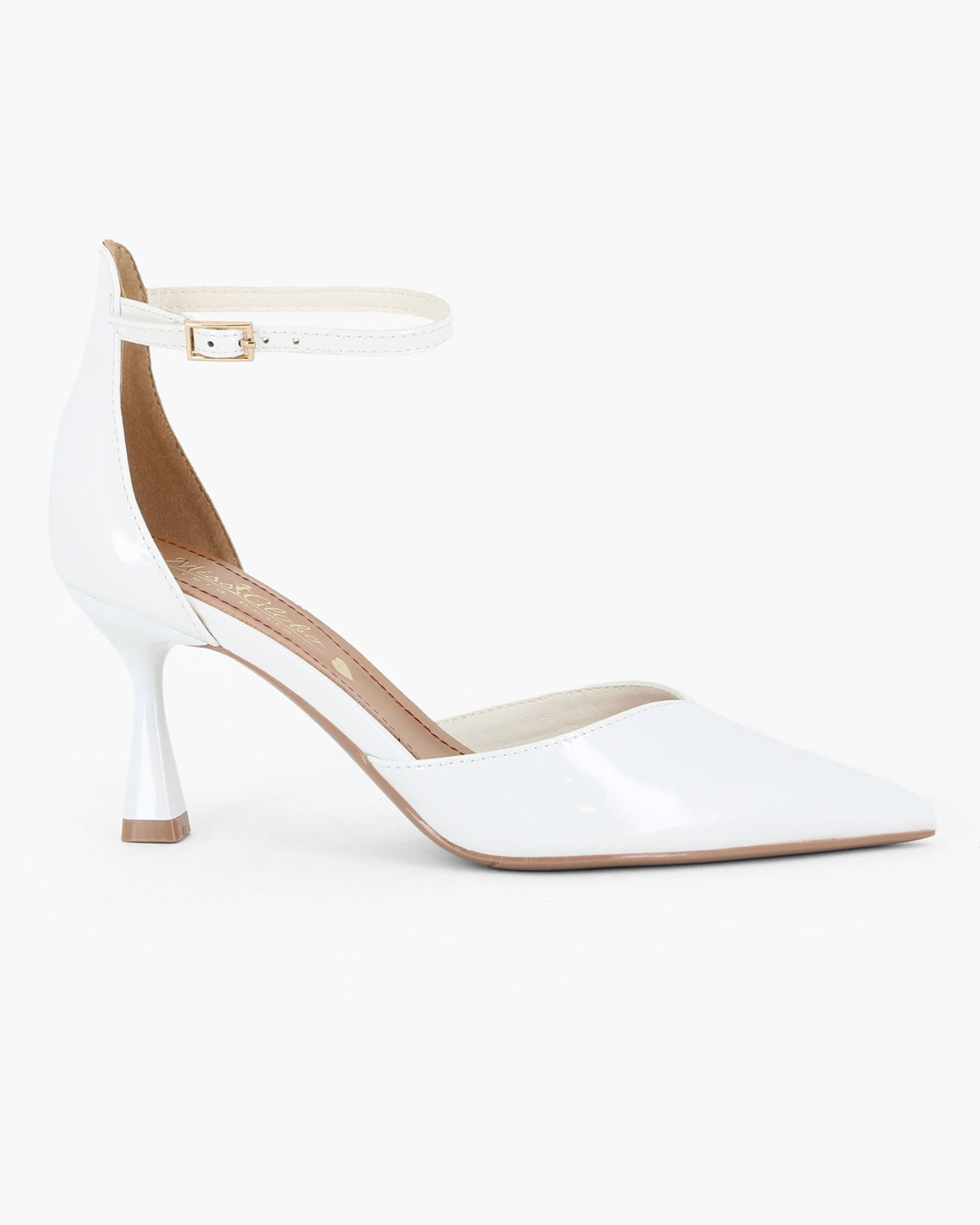 MISS GLOBO - Décolleté bianca in vernice con sottopiede in VERA PELLE e cinturino alla caviglia, tacco 7,5CM