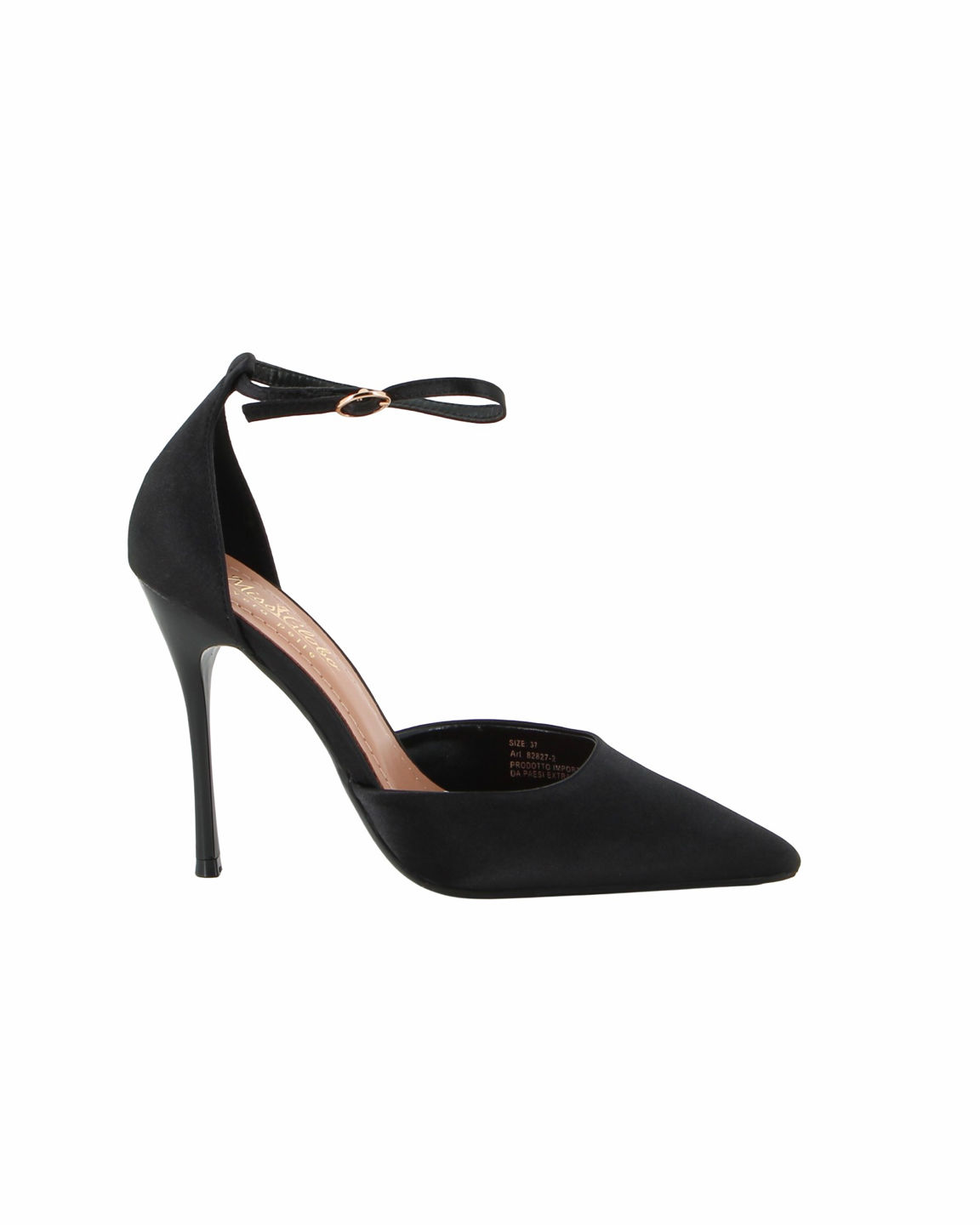 MISS GLOBO - Décolleté nera in raso con sottopiede in VERA PELLE e cinturino alla caviglia, tacco 10,5CM