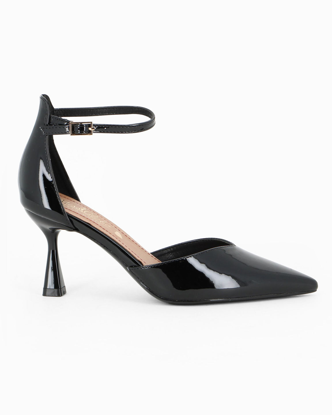 MISS GLOBO - Décolleté nera in vernice con sottopiede in VERA PELLE e cinturino alla caviglia, tacco 7,5CM