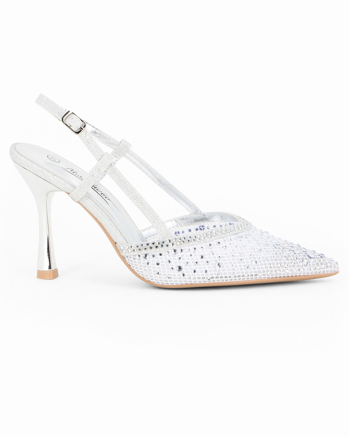 MISS GLOBO - Décolleté slingback argento traforata con strass, tacco 9CM