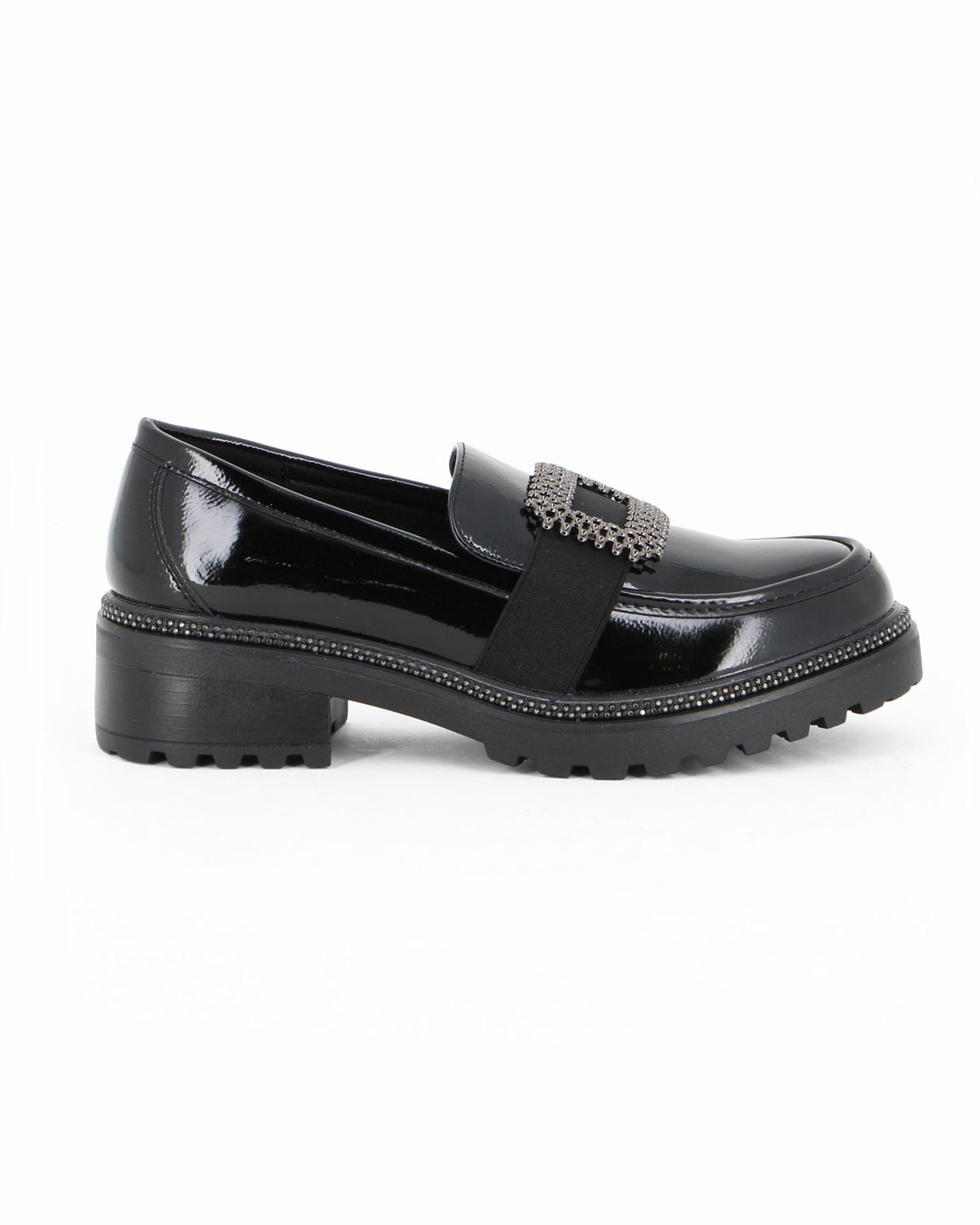 MISS GLOBO - Mocassino nero naplak con sottopiede memory soft e fascia elastica frontale con inserto metallico