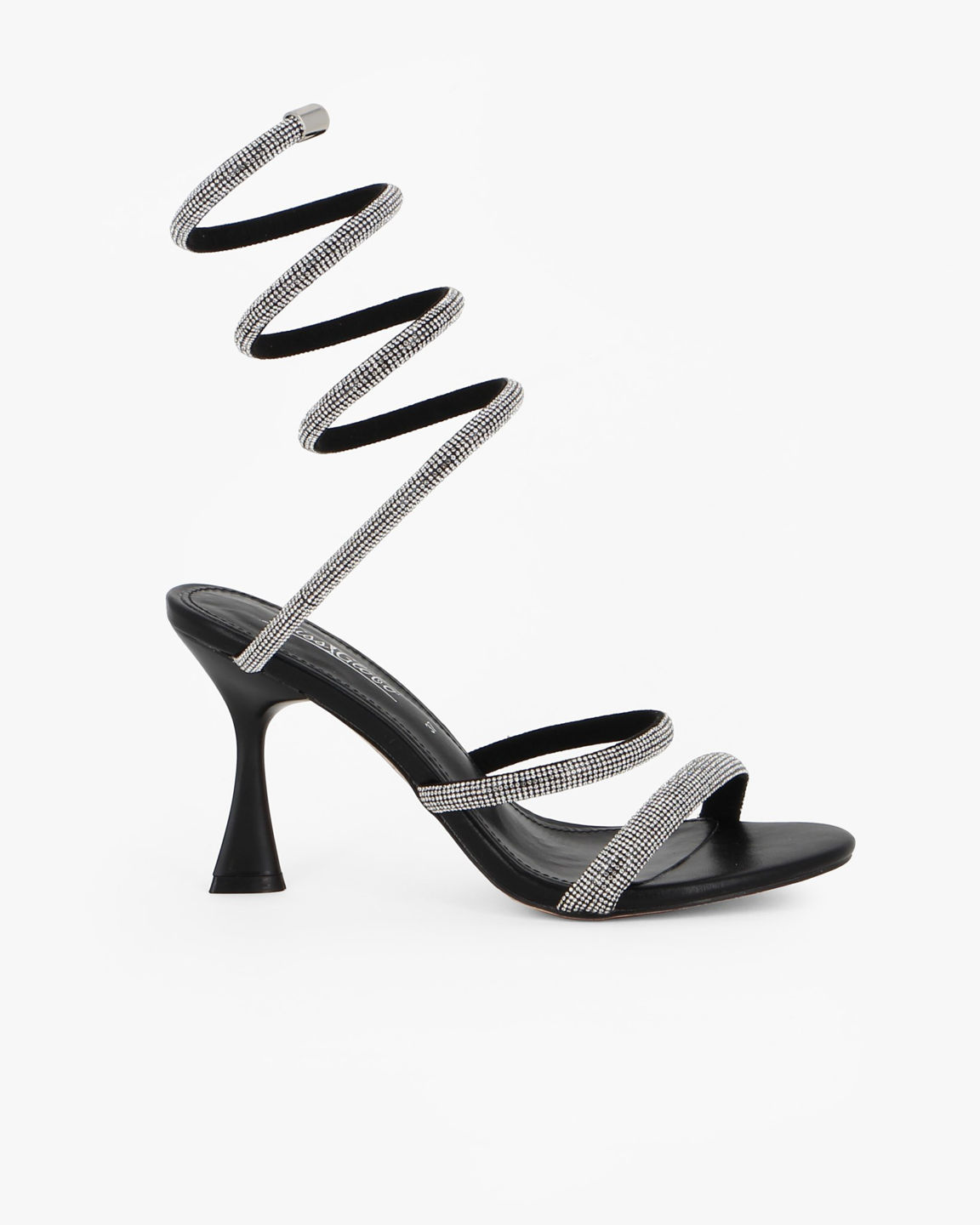 Raffinato e scenografico, questo sandalo è pensato per catturare lo sguardo ad ogni passo. Il design minimal della silhouette si unisce a dettagli luminosi: i sottili listini e il laccio spiralato alla caviglia sono impreziositi da micro strass scintillanti, per un effetto glamour e sofisticato.