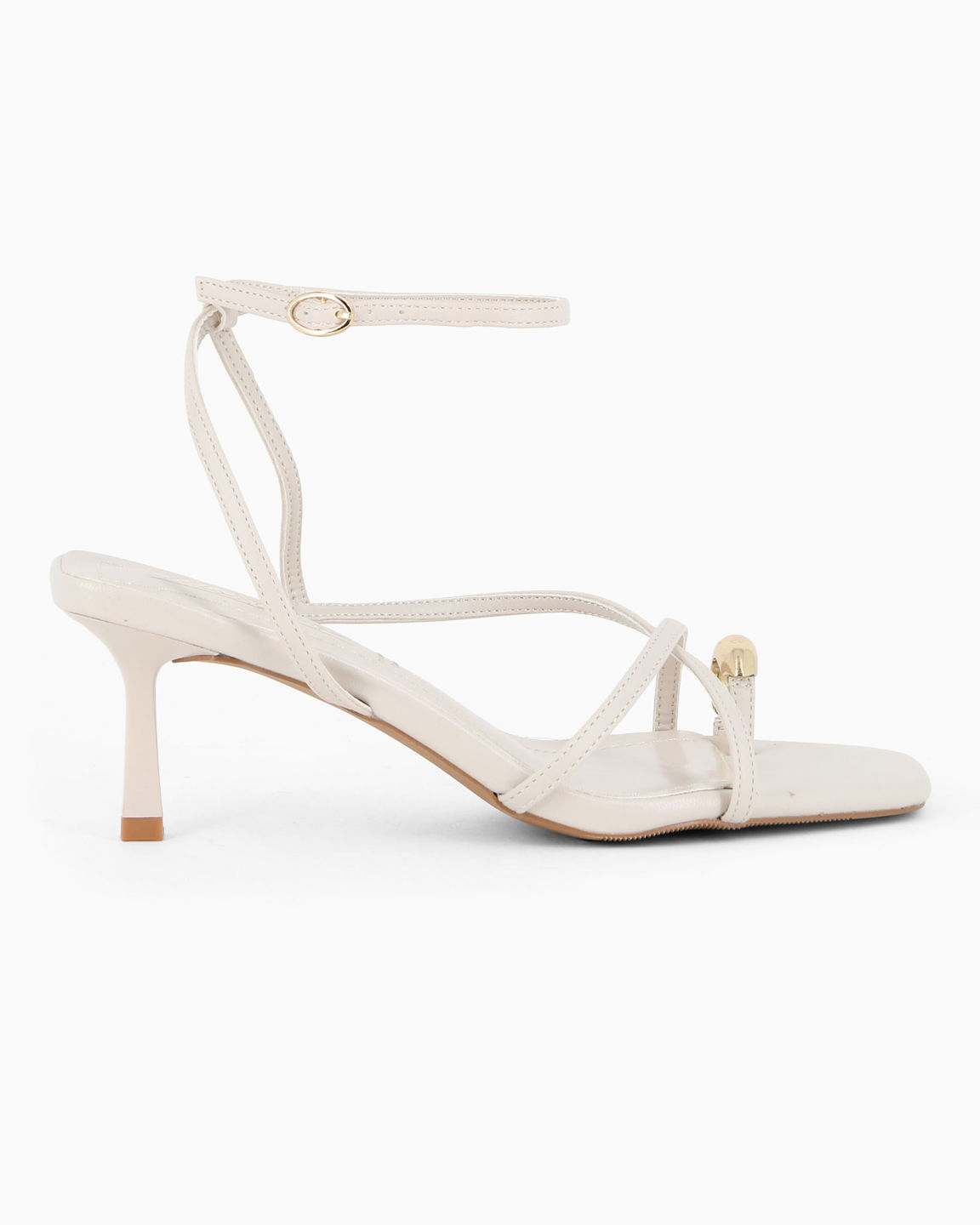 Questo sandalo infra-alluce combina la linearità delle spalline sottili con un audace dettaglio scultoreo dorato, creando un equilibrio perfetto tra minimalismo e lusso.