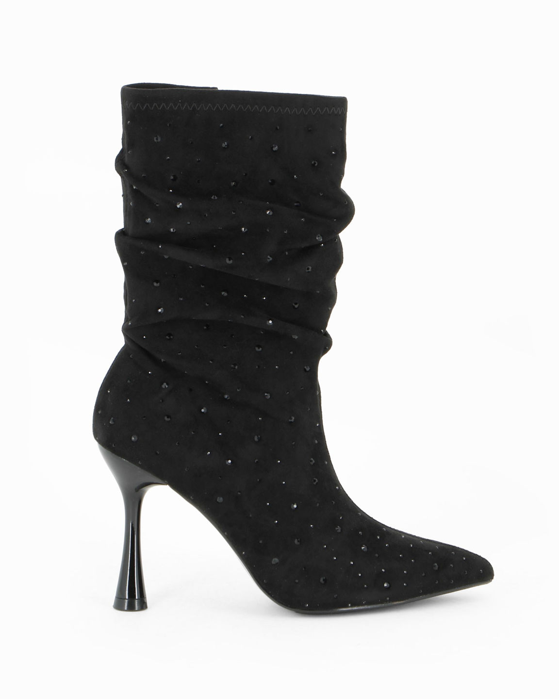 MISS GLOBO - Stivale nero scamosciato a punta con zip laterale e gambale arricciato con strass, tacco 9,5 CM