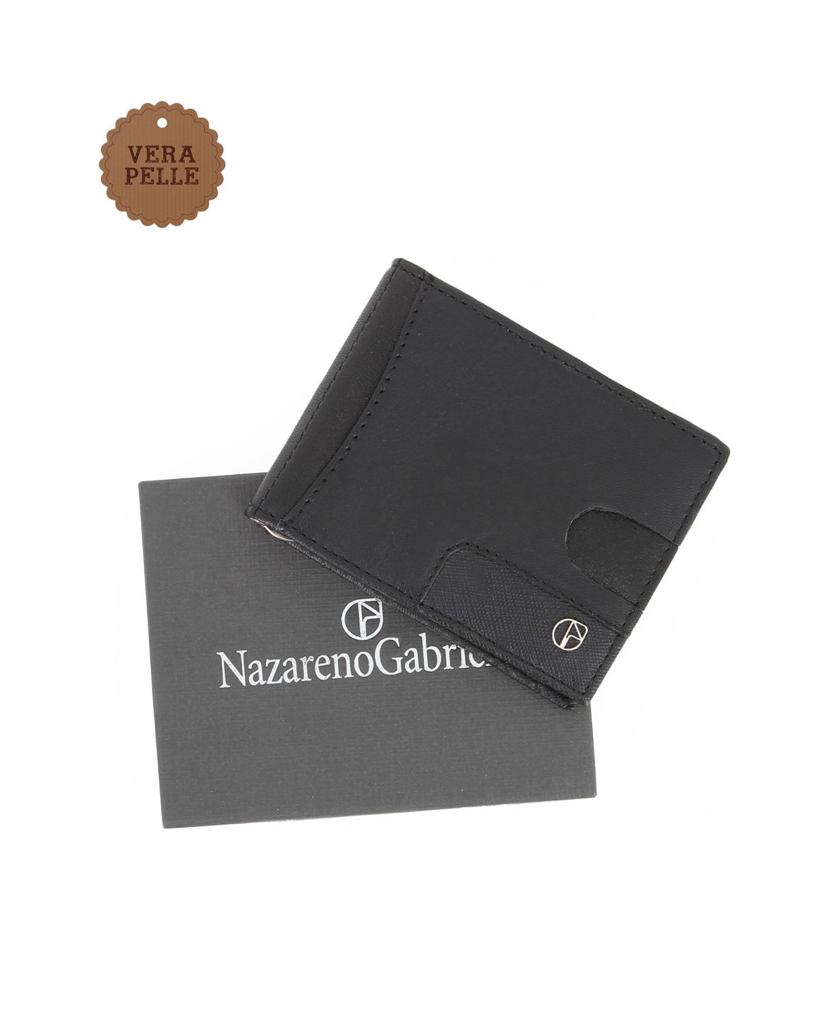 NAZARENO GABRIELLI - Portafoglio nero da uomo in VERA PELLE con fermasoldi
