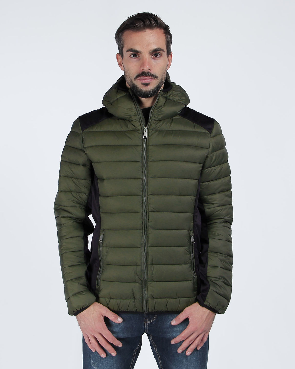 DETTAGLIO:GIUBBINO UOMO 100GR CON CAPPUCCIO. COLOR MILITARE CON FASCE NERE LUNGO I FIANCHI E SUL CAPPUCCIO.CHIUSURE LAMPO ANCHE NELLE TASCHE. COMODO E ALLA MODA. IL MODELLO E ALTO 178cm E INDOSSA UNA TAGLIA M.