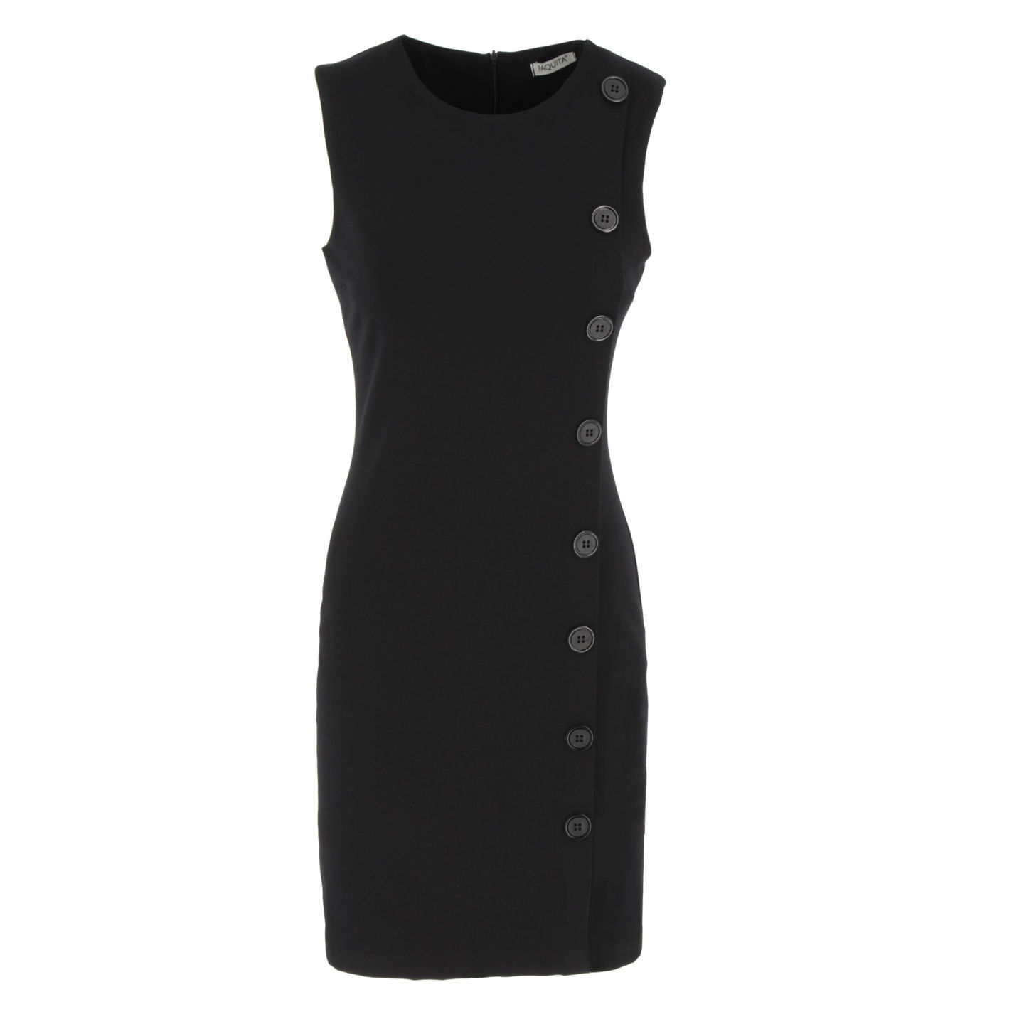 PAQUITA - Abito nero smanicato con bottoni decorativi laterali e zip posteriore