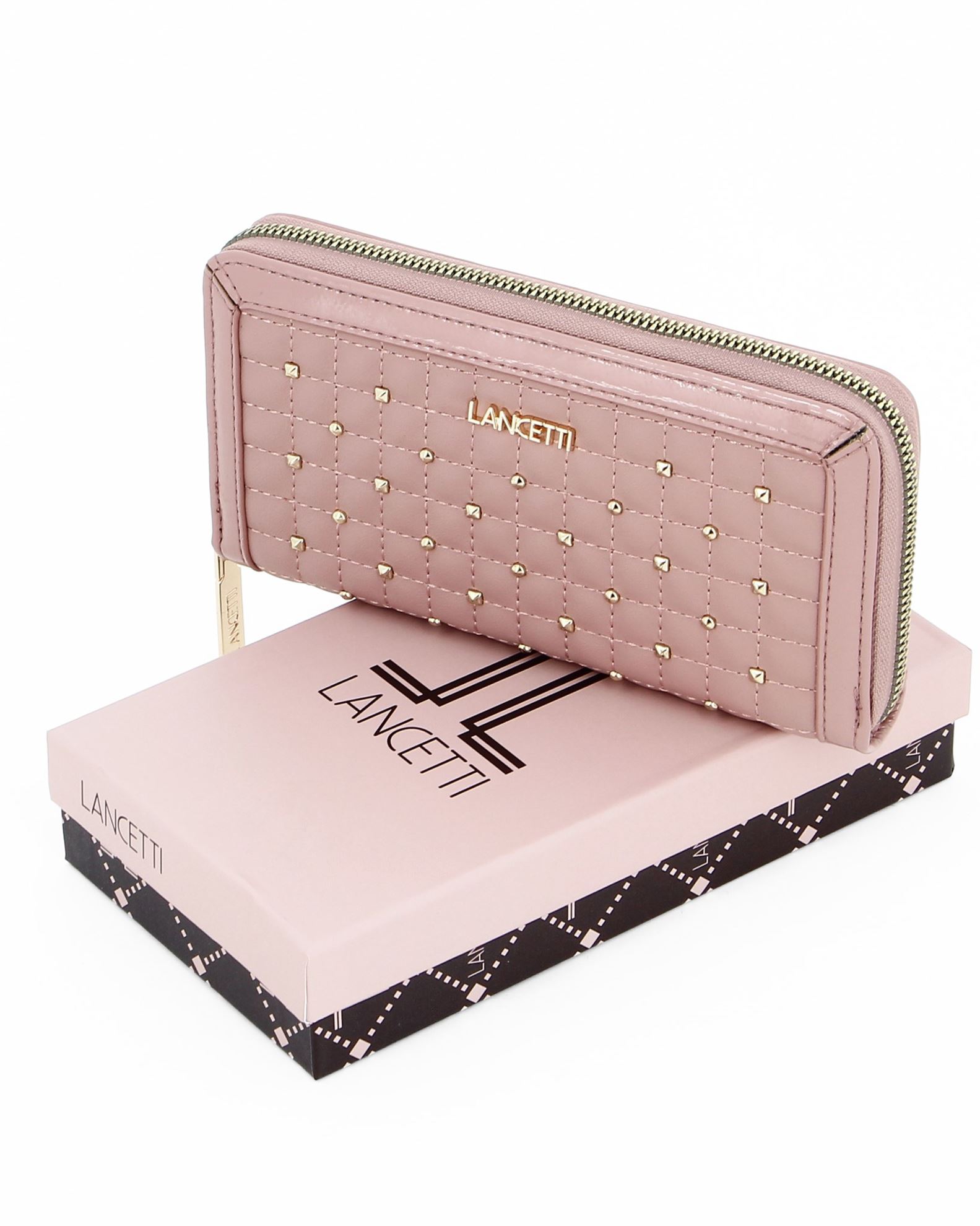 Portafoglio donna rosa con borchie frontali, portaspicci e portacarte - LANCETTI