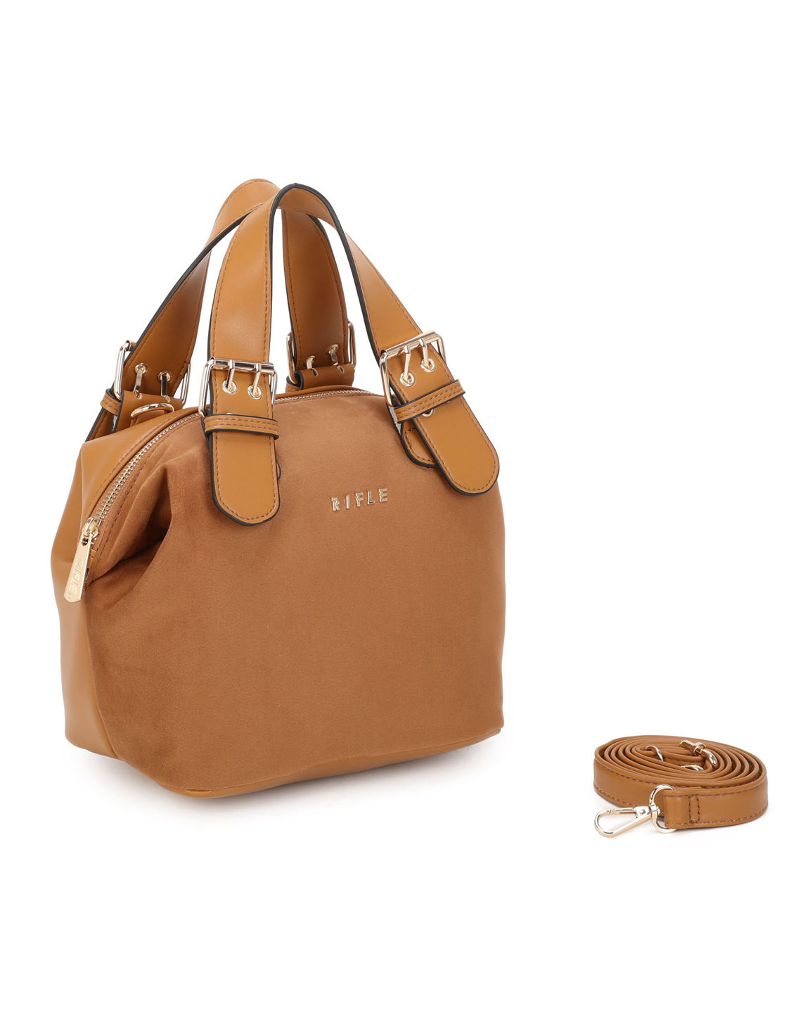 RIFLE - Borsa a mano camel con parte frontale scamosciata e fibbie sui manici, tracolla removibile