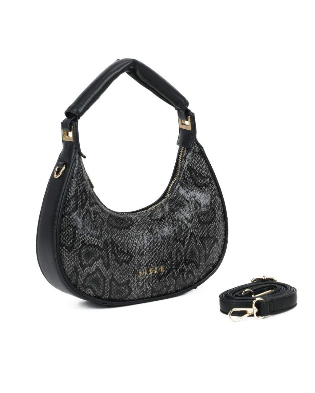 RIFLE - Borsa a spalla nera pitonata con manico imbottito, tracolla removibile