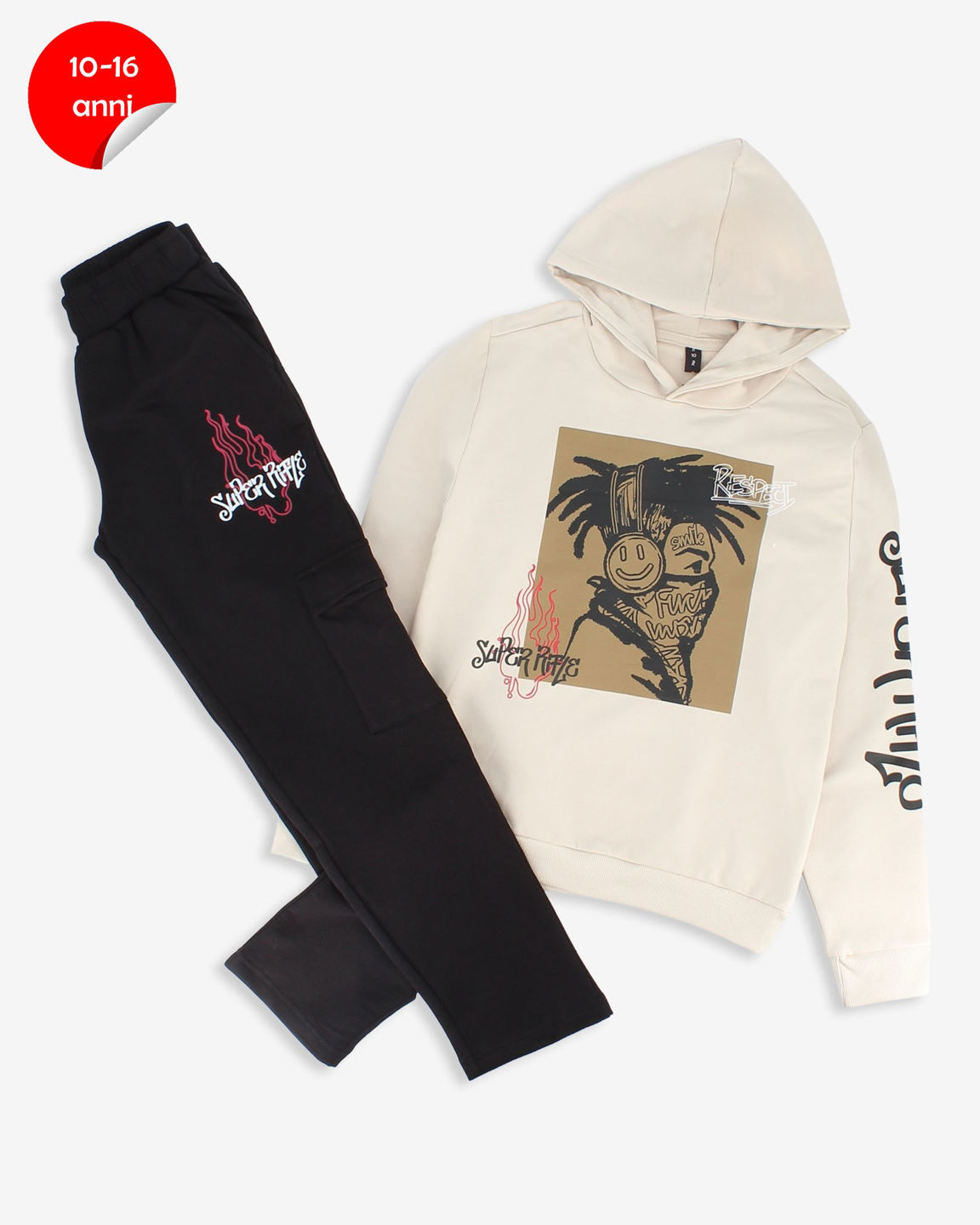 RIFLE - COMPLETO TUTA FELPA BEIGE CON CAPPUCCIO E STAMPA DA RAGAZZO