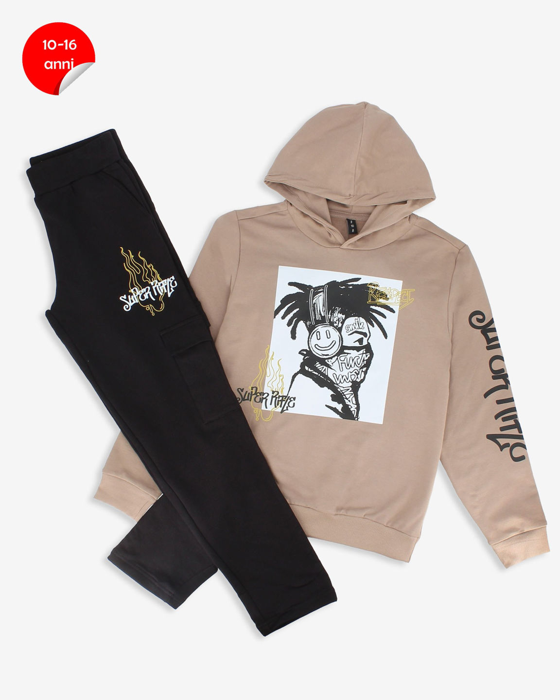 RIFLE - COMPLETO TUTA FELPA BEIGE CON CAPPUCCIO E STAMPA DA RAGAZZO