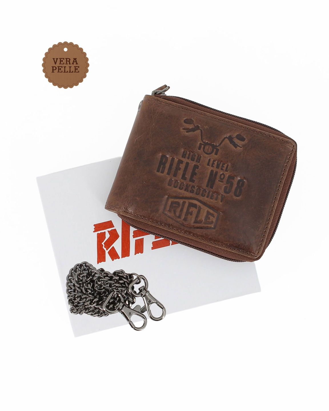 RIFLE - Portafoglio marrone in VERA PELLE da uomo con chiusura a zip e catenina removibile