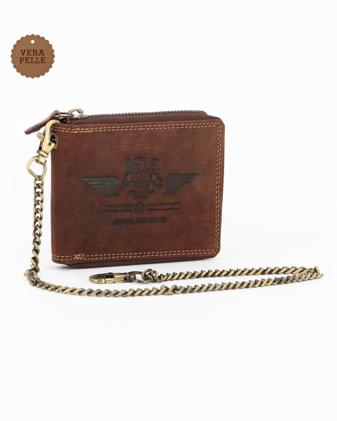 RIFLE - Portafoglio cuoio in VERA PELLE da uomo con zip e catenina removibile
