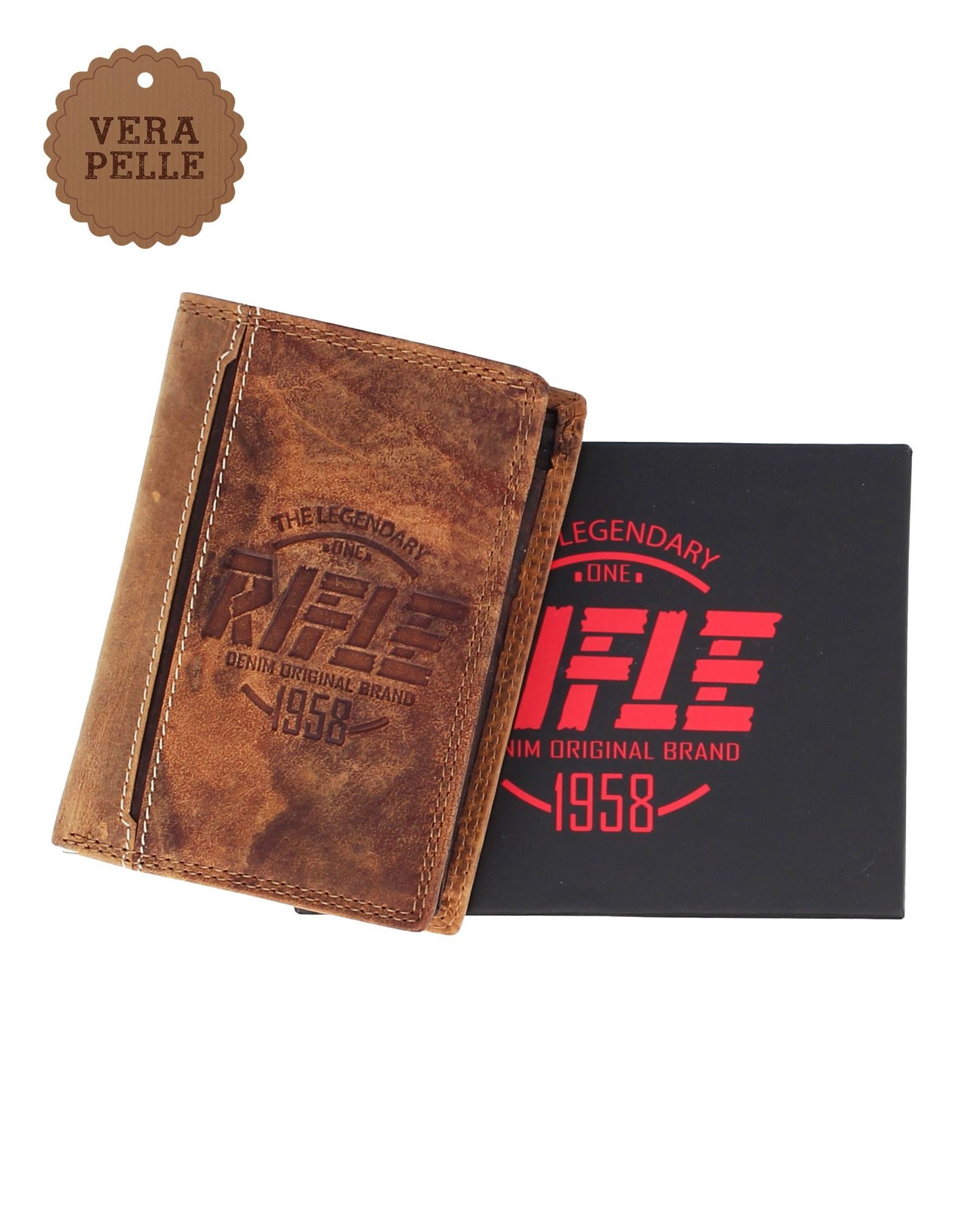 RIFLE - Portafoglio uomo tan con logo frontale e ribaltina in VERA PELLE
