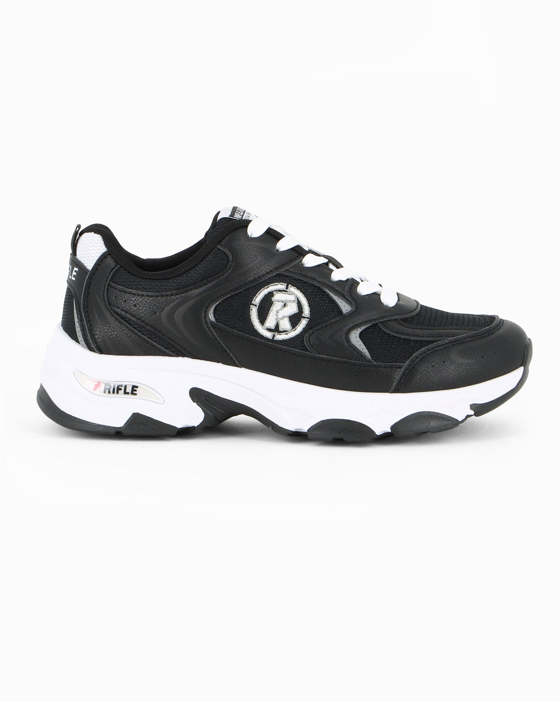 Il contrasto black & white, con lacci bianchi e maxi suola chunky, dona carattere e tendenza al modello.