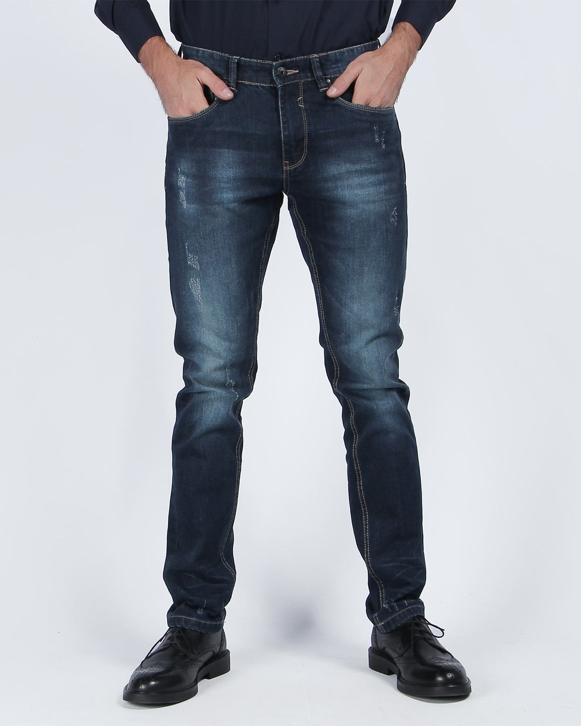 DETTAGLIO:PANTALONE UOMO SLIM SABBIATO. 5TASCHE CON CHIUSURA A ZIP CON BOTTONE. IL MODELLO INDOSSA LA TAGLIA 46
